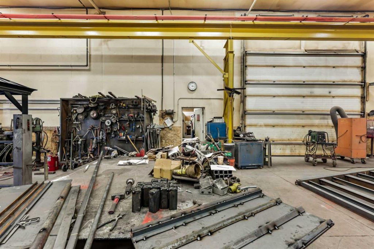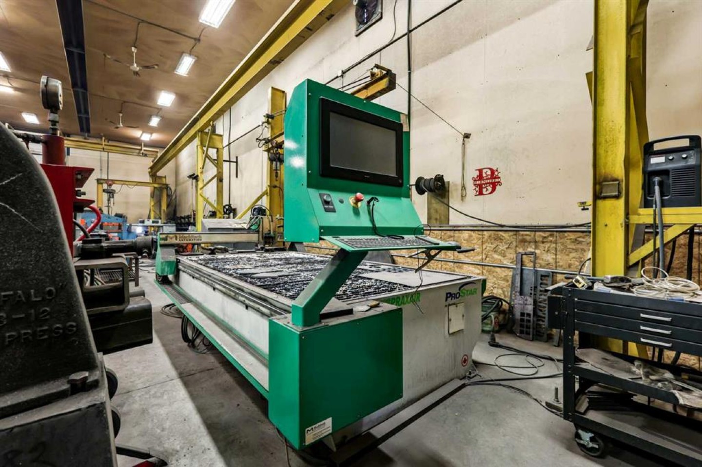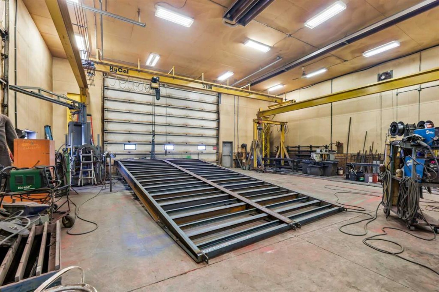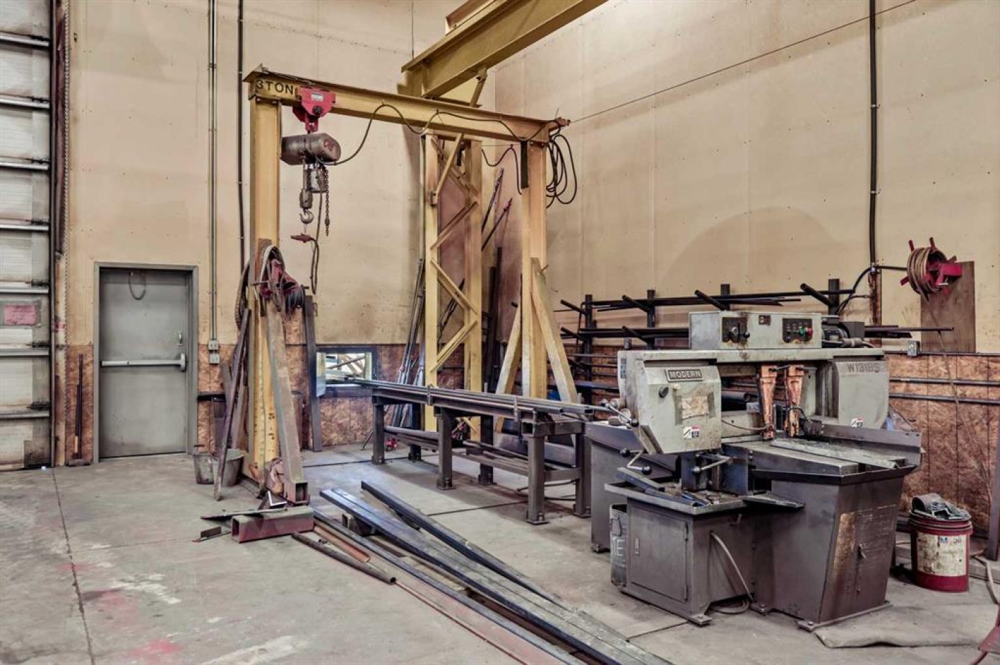 Air compressor w/Air-lines (hooked up to 6x hose reels with air hose), Large Fording Pedestal Grinder, Compartment door for rolling steel into saw, 2 Exhaust Fans, First Aid Kit, Lockers, wall crane 1 ton, 5 ton OVERHEAD shop cantry crane with pendulam (80 ft of Crane way), Rollerbed outside w/steel rack, modern 3 phase drill press, wall rack for steel (inside by cold saw), Stick machine Ideal ARC 300 & small 1/2 ton crane, 3-phase converter, Tool room with one wall cabinet, one Bolt Storage bin and shelves