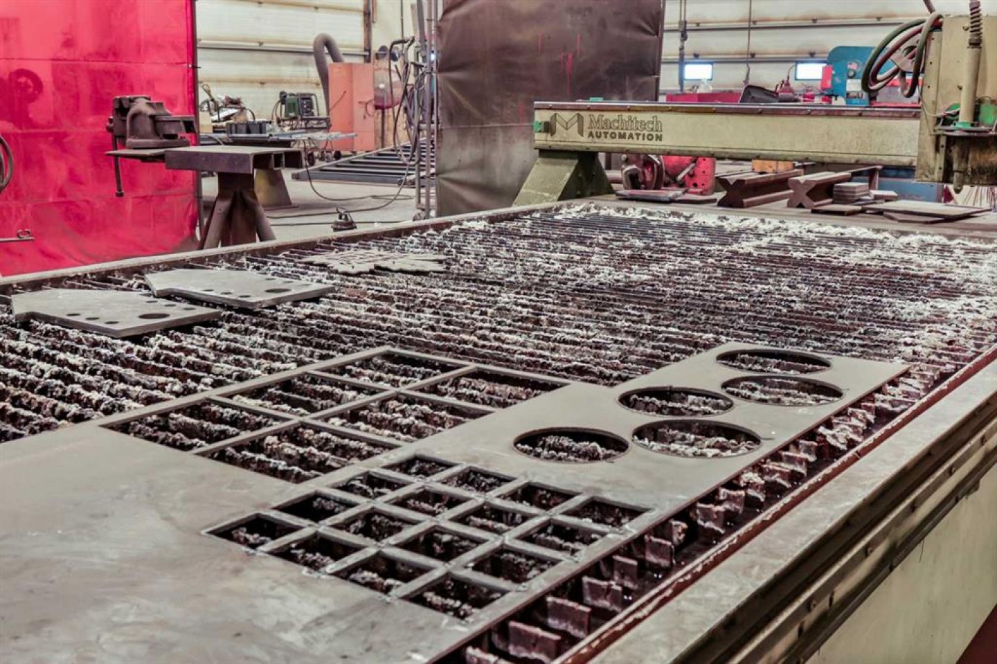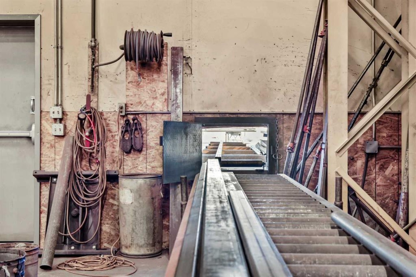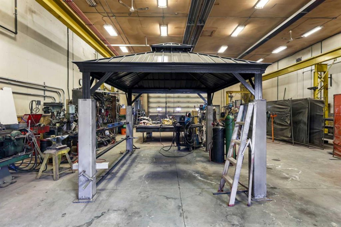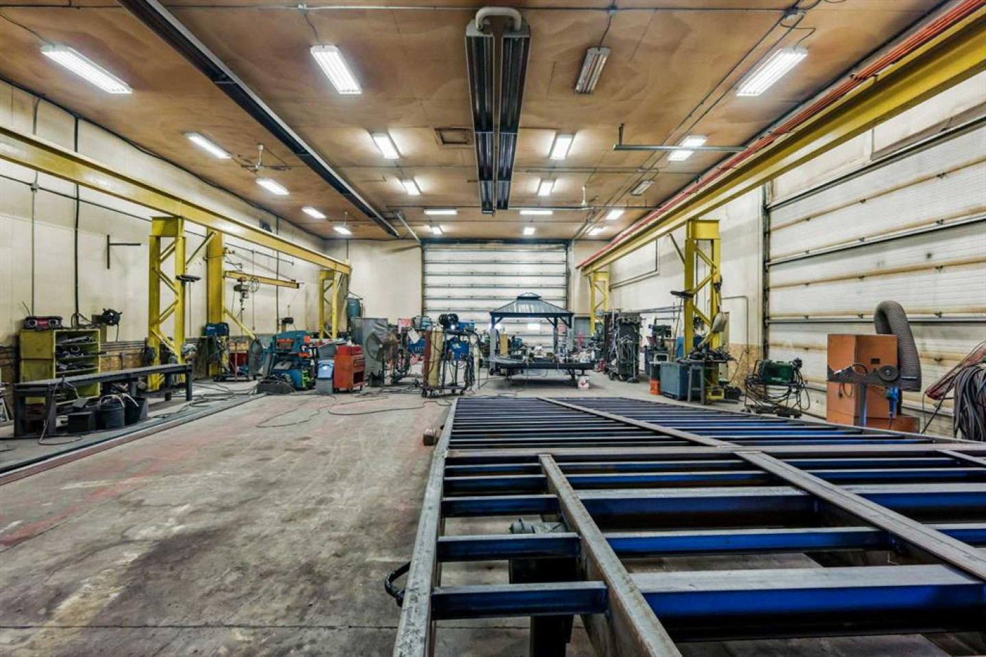 Air compressor w/Air-lines (hooked up to 6x hose reels with air hose), Large Fording Pedestal Grinder, Compartment door for rolling steel into saw, 2 Exhaust Fans, First Aid Kit, Lockers, wall crane 1 ton, 5 ton OVERHEAD shop cantry crane with pendulam (80 ft of Crane way), Rollerbed outside w/steel rack, modern 3 phase drill press, wall rack for steel (inside by cold saw), Stick machine Ideal ARC 300 & small 1/2 ton crane, 3-phase converter, Tool room with one wall cabinet, one Bolt Storage bin and shelves