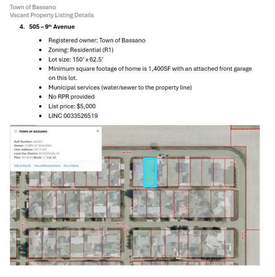 BEAUTIFUL BASSANO - Welcome to an incredible opportunity to build your dream home in vibrant Bassano for only $5,000! This prime lot has all town services conveniently run to the property line, ready for your vision. Enjoy Bassano’s charming community with an outdoor pool, local arena, parks, and a revitalized downtown. Buyers must submit a development permit application within 6 months of signing for a taxable improvement per LUB 921/21. There is also a build timeline requirement and minimum build size of 1400sqft with a front attached garage. Allowed property types include Prefab Homes and Stick Build. Mobile homes are NOT allowed. Call now to get more information as we have multiple lots available!