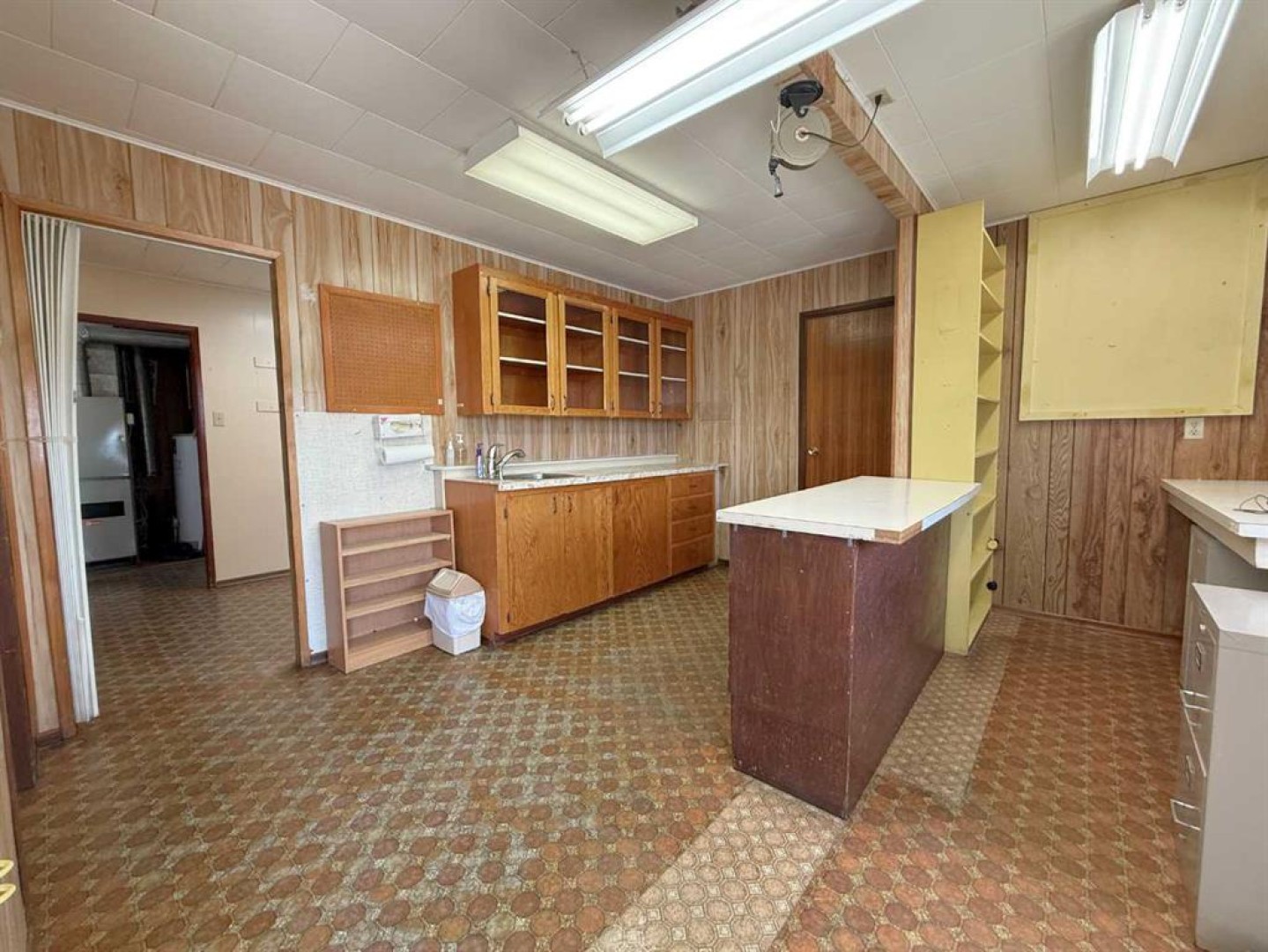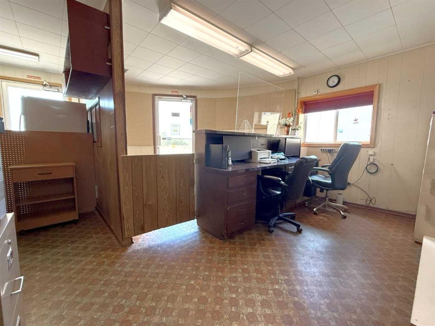 Excellent visibility in a prime location. With over 2000 sq ft on the main level, this building offers the room and flexibility to turn your imagination into reality. Main office space is 964 sq ft, and could be completely customized to suit your needs. Shop side is 1054 sq ft of wide open work space , with 11 ft high ceiling, 10 ft high x 11.7 ft wide door. Above the office there’s a suite that was livable, but hasn’t been used in years. Only access at this time is through the attic hatch, the stairs were removed many years ago. Foundation is concrete slab, exterior is wrapped in metal siding, making this a very easy to maintain building. For many years this was the home of a beloved vet clinic, and still has the potential for animal care. It could also make an excellent office space, animal grooming and boarding, shop/mechanic space, vehicle detailing, the possibilities are endless for what you could bring to this growing community.