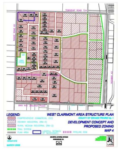 Remnant of the land NW section included in the west Clairmont industrial ASP developable to light industrial uses. 7 lots were previously subdivided as phase 1, and additional lots can be subdivided as subsequent phases. All services including water, sanitary sewer, 3phase power, telecommunication and fibre optic cables are available on-site. Previously, the lots subdivision was approved as phase 1a, and the 7 lots subdivision was approved as phase 1b(both expired now; however, they can be applied again ). Refer to the tentative plan. A new subdivision application can be approved in short order.