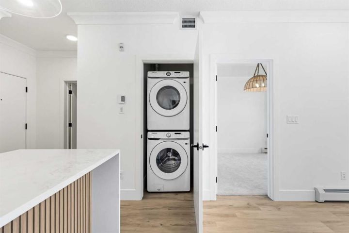Experience elevated urban living in this brand-new, never-occupied 2-bedroom, 1-bathroom residence located in the highly desirable Currie Barracks community—one of Calgary’s most sought-after neighborhoods. Perfectly situated near Mount Royal University, this modern condo is ideal for professionals, students, or investors looking for exceptional rental potential in a prime location. From the moment you step through the grand front entrance, you’ll be greeted by an atmosphere of modern sophistication. The open-concept layout features designer wall paneling in the living area, upgraded lighting, and an abundance of natural light streaming through large west-facing windows that lead to a spacious balcony overlooking the peaceful courtyard—the perfect place to unwind after a long day. The gourmet kitchen showcases custom cabinetry with matching panel-front fridge and dishwasher, sleek quartz countertops, stainless steel appliances, a gas cooktop, and a convenient breakfast bar ideal for casual dining. Every detail has been thoughtfully considered to blend functionality with style, offering ample cupboard and counter space to enhance everyday living. Both bedrooms are generously sized, providing flexibility for a guest room, home office, or roommate setup. The spa-inspired bathroom boasts modern fixtures and a quartz-topped vanity, while the stacked in-suite laundry offers everyday convenience. Additional highlights include luxury vinyl plank flooring, A/C rough-in for future cooling, and secure building access for peace of mind. Residents of Currie Barracks enjoy a vibrant, walkable lifestyle surrounded by boutique shops, cafés, parks, and pathways. Commuting is effortless with quick access to major routes and public transit, and you’re only minutes from downtown Calgary and local golf courses for leisure and recreation. Whether you’re seeking a luxurious urban retreat or a turnkey investment property, this pristine unit offers a perfect blend of style, convenience, and modern living in an unbeatable location.