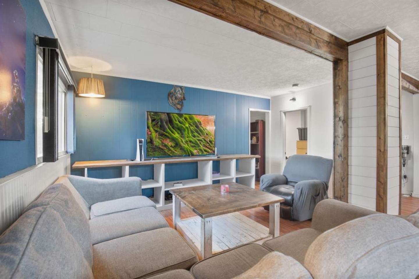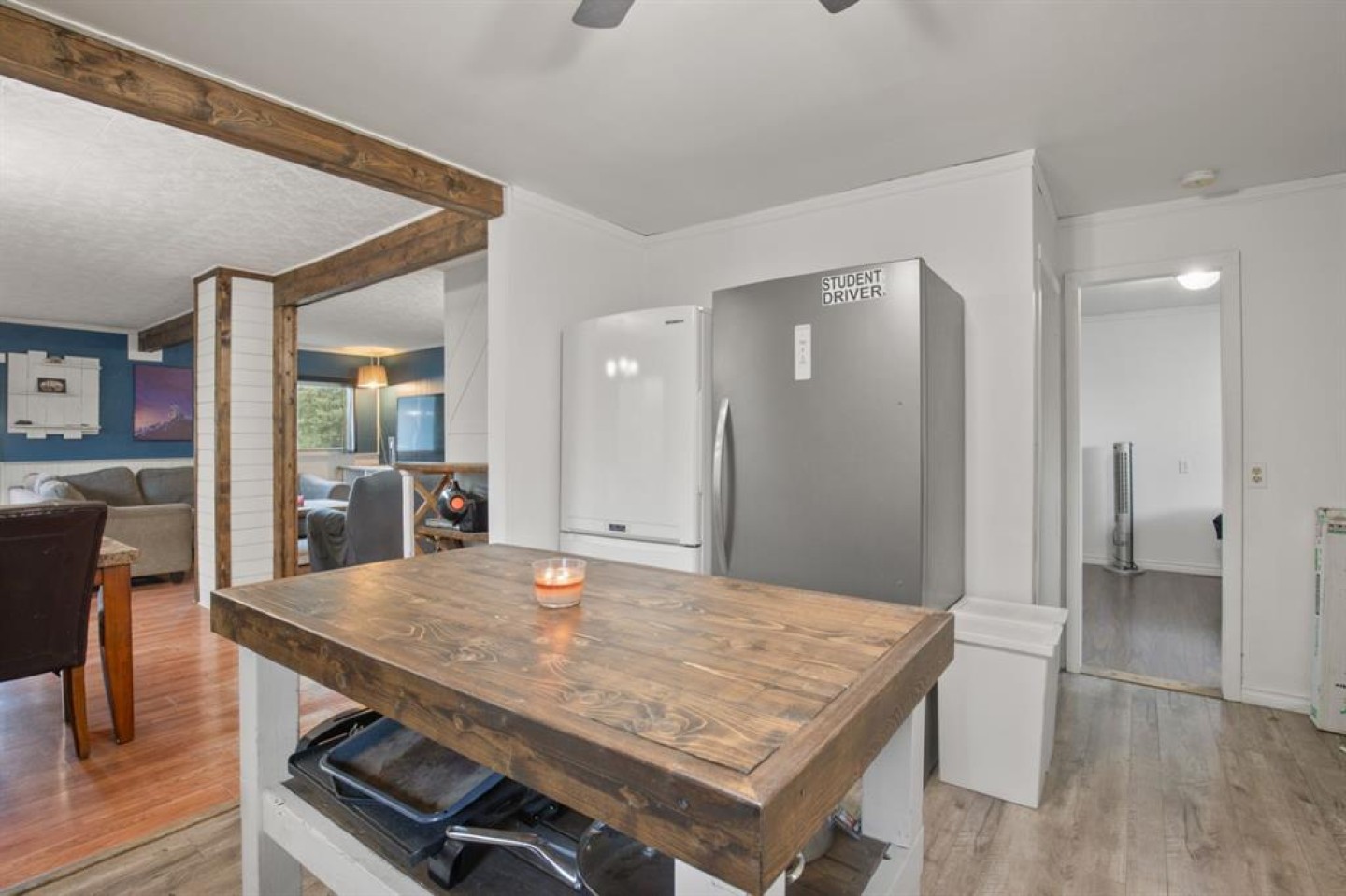 This charming 1946 bungalow blends timeless character with thoughtful modern updates, set on a spacious 6,000 sq ft lot in the heart of Bowden. Framed by mature hedges for privacy, the home welcomes you with a west-facing front deck and a generous entry foyer. Inside, the open-concept dining area flows into both the updated kitchen and cozy living room. Rustic wood beams and a wood-burning stove with a striking stone mosaic surround create a warm, inviting atmosphere. The kitchen features dark cabinetry, a modern white pantry, butcher-block countertops, a farmhouse sink, tile backsplash, a centre island, and an almost-new dishwasher. Three bedrooms, including a spacious primary, and a fully updated 4-piece bathroom complete the main floor. Recent updates include a new washer and dryer, new central vacuum system, re-shingled front porch, furnace servicing, and a new hot water tank. An upgraded electrical panel and service are also planned. Out back, a fully enclosed breezeway connects to a single detached garage and a large storage room. The south-facing backyard is fully fenced—ideal for pets, gardening, or simply relaxing in the sun. A rear parking pad provides extra room for vehicles, a trailer, or RV. The durable metal roof on the main house adds long-term peace of mind, and the Bowden Golf Course is just a short walk away. A great opportunity for first-time buyers, investors, or anyone looking for a move-in-ready home with character, comfort, and lasting value.