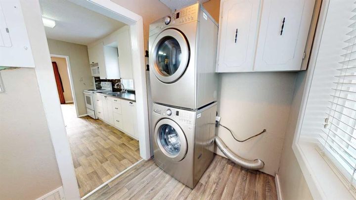Electric Range, Microwave, Refrigerator, Washer/Dryer Stacked, Window Coverings