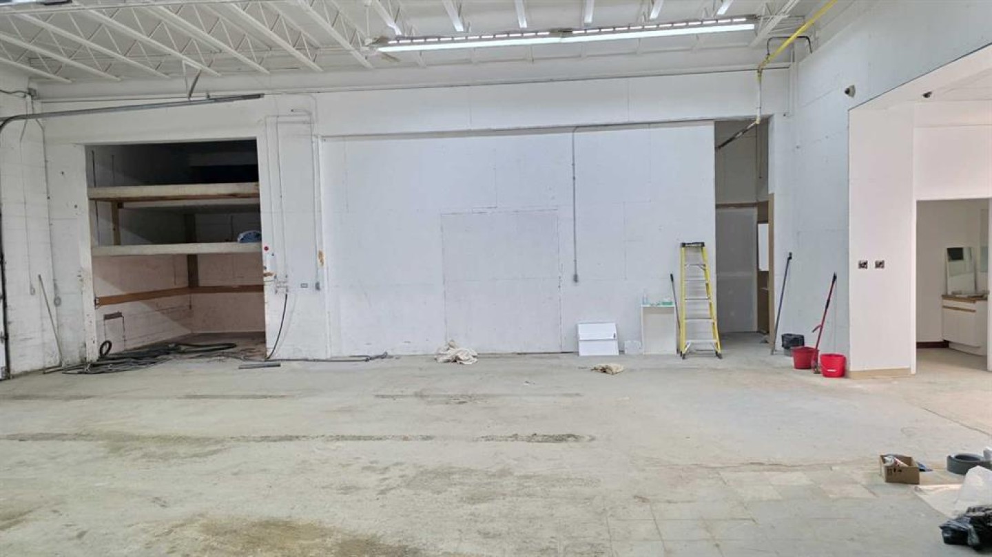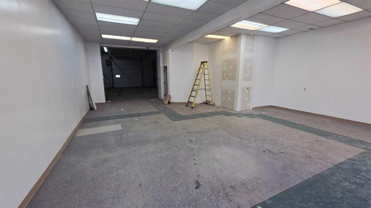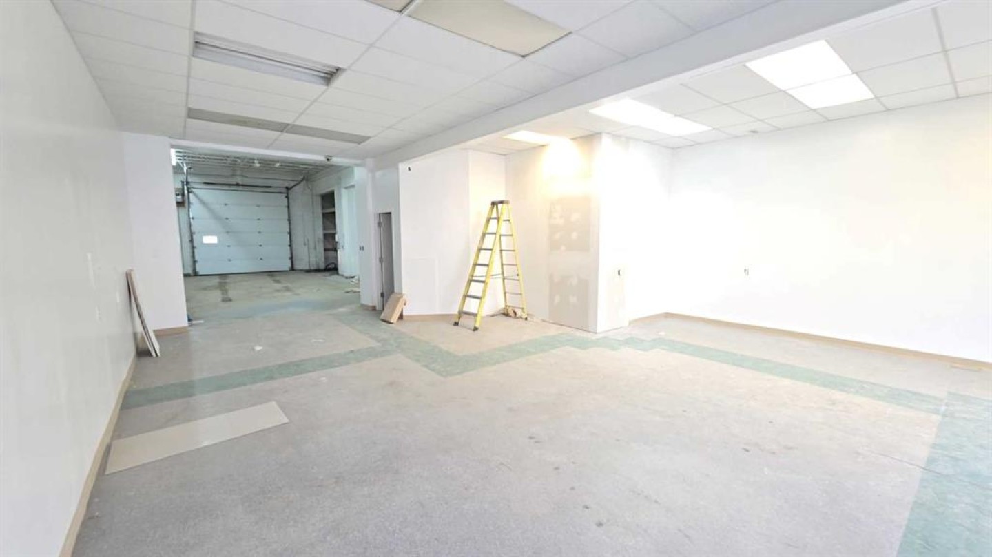 This is a great option for the small service company to set up operations - with a 12 X 12 overhead door in the back for access it makes a very useful area for operations, The front reception area is about 30 X 25, there is a mezzanine area for small parts or general storage, a 2 piece bathroom and a kitchen area. Great location on main street with a general parking area in front. At just under 1500 sq ft of space you have an abundance of space for storage, vehicle and reception all ready for you.