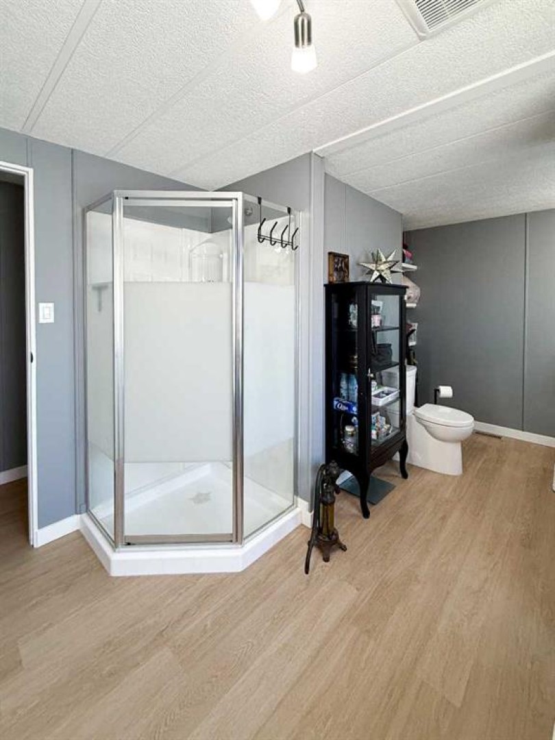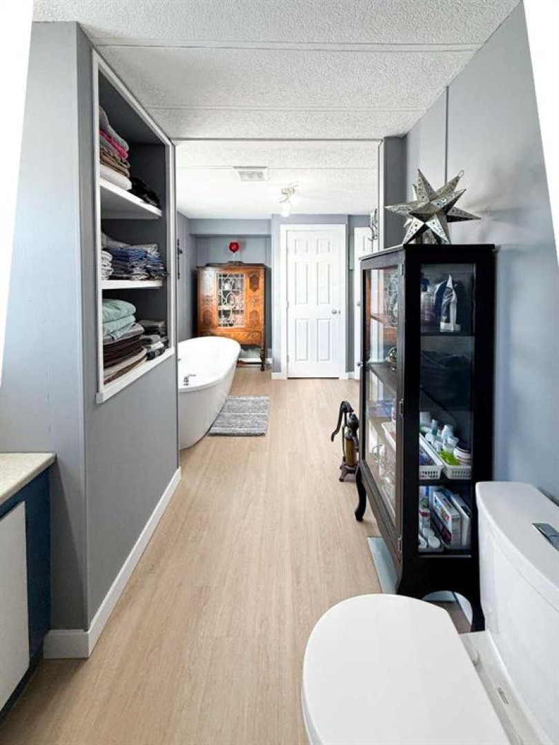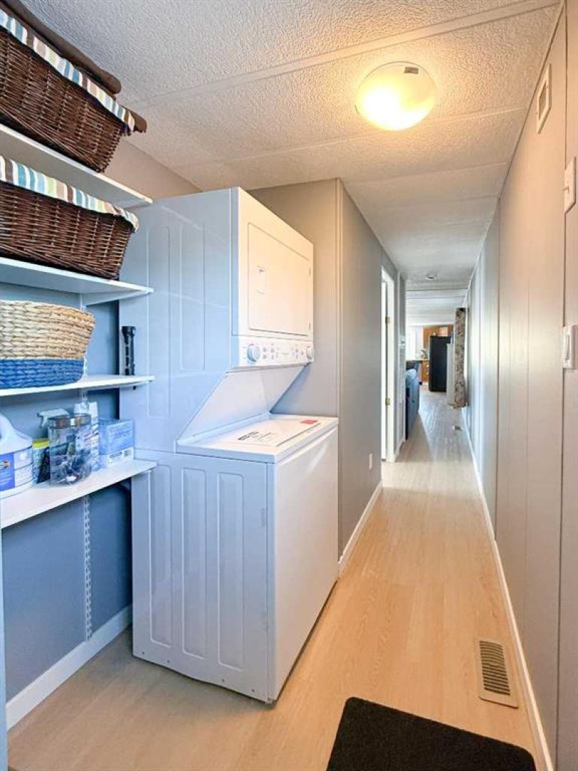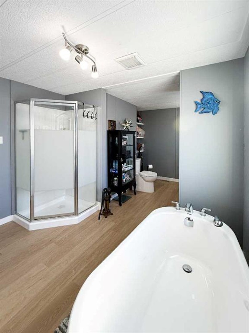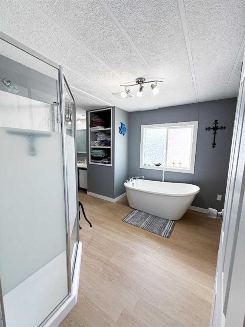 This beautifully updated home offers the perfect blend of stylish finishes and everyday livability. The addition has been completely redone and luxury vinyl plank flooring, new lighting, fresh paint and trim flow throughout the entire home. The kitchen features updated cabinetry with added pantry storage as you walk in, butcher block countertops crafted from naturally durable Acacia bamboo, a new dishwasher and newer appliances create inviting space for daily living. The kitchen, eating area and living room are all open to one another, offering a bright and cohesive layout ideal for everyday living and entertaining. A former second bedroom has been reconfigured to create a spacious, spa-inspired bathroom complete with a free-standing tub, corner shower, abundant storage and a newly relocated hot water tank for easy access. The home offers two generously sized bedrooms, including a primary bedroom with a custom closet. Vinyl windows, updated doors, a new furnace, fully updated plumbing and the complete removal of Poly-B offer long-term reliability and reduced maintenance. Outside, enjoy a fully fenced yard with an oversized, partially covered deck—perfect for entertaining—along with a clothesline, two storage sheds and a new exterior tap. Both the sheds and the home have been recently reshingled, completing this well maintained and move-in-ready property. Call today to book your private tour!!