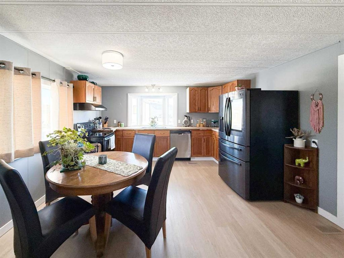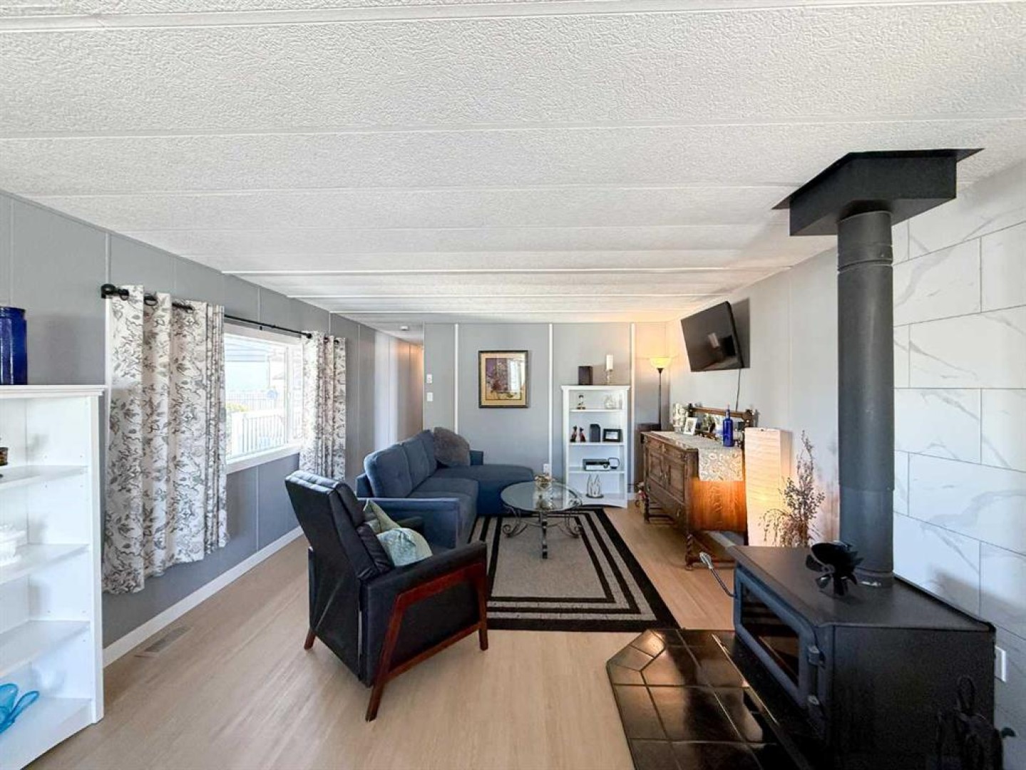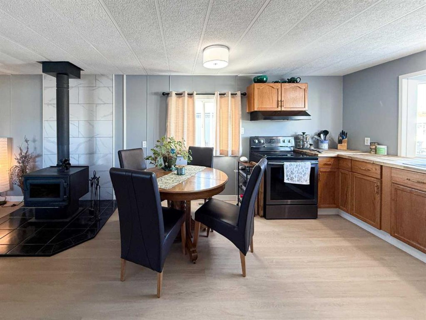 This beautifully updated home offers the perfect blend of stylish finishes and everyday livability. The addition has been completely redone and luxury vinyl plank flooring, new lighting, fresh paint and trim flow throughout the entire home. The kitchen features updated cabinetry with added pantry storage as you walk in, butcher block countertops crafted from naturally durable Acacia bamboo, a new dishwasher and newer appliances create inviting space for daily living. The kitchen, eating area and living room are all open to one another, offering a bright and cohesive layout ideal for everyday living and entertaining. A former second bedroom has been reconfigured to create a spacious, spa-inspired bathroom complete with a free-standing tub, corner shower, abundant storage and a newly relocated hot water tank for easy access. The home offers two generously sized bedrooms, including a primary bedroom with a custom closet. Vinyl windows, updated doors, a new furnace, fully updated plumbing and the complete removal of Poly-B offer long-term reliability and reduced maintenance. Outside, enjoy a fully fenced yard with an oversized, partially covered deck—perfect for entertaining—along with a clothesline, two storage sheds and a new exterior tap. Both the sheds and the home have been recently reshingled, completing this well maintained and move-in-ready property. Call today to book your private tour!!