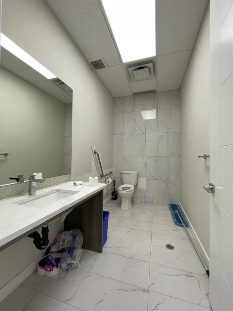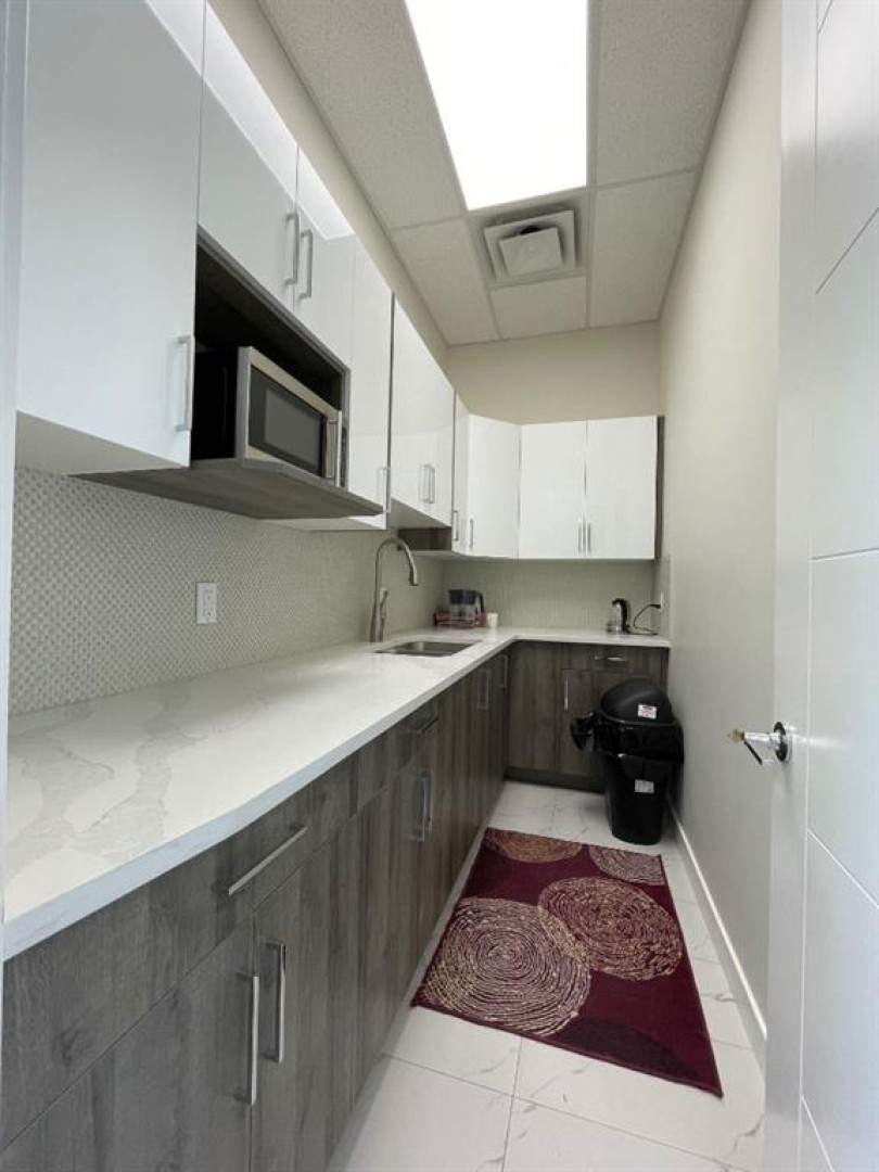 Turn key MAIN FLOOR office space with FULL WASHROOM, FULL KITCHEN. 4 office rooms, sitting area and receptionist space. MAIN FLOOR has lots of windows and natural sunlight with floor to ceiling windows at the front. 4 ASSIGNED PARKING stalls attached to this unit. HIGH VISIBILITY LOCATION.