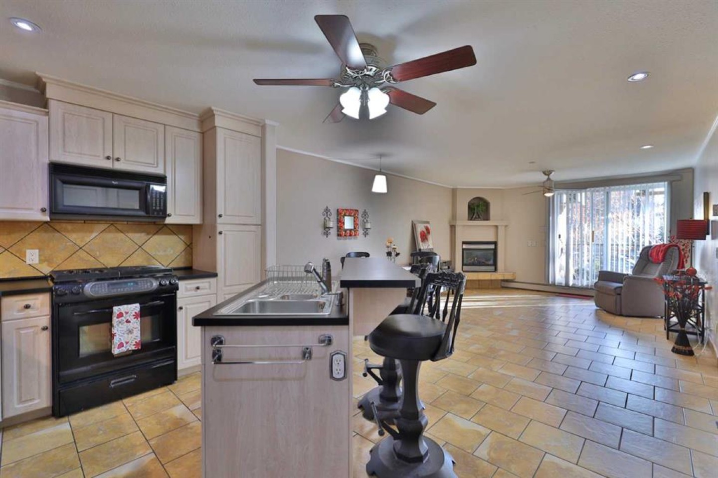 Welcome to Fieldstone Place Condomium and this Lovely 1 Bedroom Suite. Fieldstone is mere steps to all the pathways around Mirror Lake and just a block to all the downtown shopping and festivities. Once you're in the Beautiful Building and past the mailboxes, you'll find this main floor home. It has a nice open floor plan with just enough kitchen cabinetry, handy island, eating area and living room. You can even enjoy the cozy corner gas fireplace on those cool days and appreciate the A/C on the warm ones. From here there are patio doors out to the covered East facing deck, complete with overhead heaters and BBQ gas hook-up. Back inside, you'll find the primary bedroom which has double closets, shoe organizer closet and again, access to the East facing deck. Completing the suite is a 3 pc. washroom (w/ walk-in shower and washroom heater) and the laundry space. Again, with neat organizers in the cupboard. You'll love that you never have to leave the building to get to your vehicle that is securely parked in the underground parkade as well as the secure storage space. Ohhhh! and when you want a little more space to gather the family, you will LOVE the "Sunset Lounge" on the 4th floor with a small kitchen, numerous tables, another fireplace AND a huge West facing deck! Take a look at what carefree condo living can look like! (Building is Adults 55+)