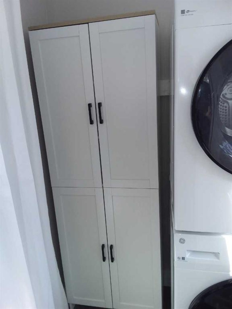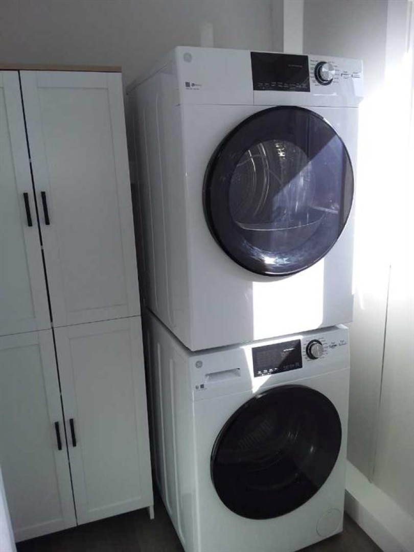 Electric Stove, Microwave Hood Fan, Refrigerator, Washer/Dryer Stacked
